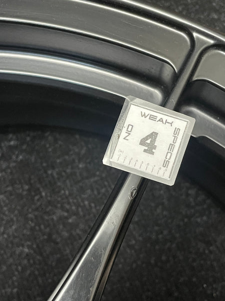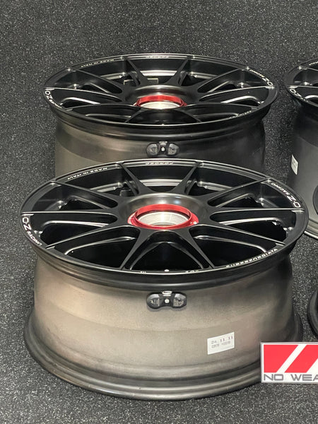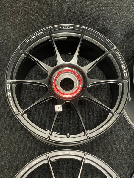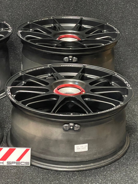 Super light forged wheels from Italy: OZ Superforgiata. A classic 10 spoke design with deep pockets in the spokes to save weight. Rears have nice concavity to them as well. Matte black with red anodized center lock ring. These are one of the lightest 19" wheels made for 997s.